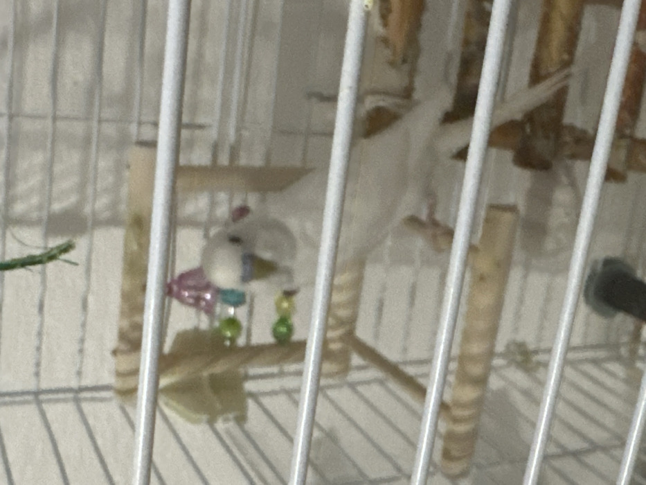 A white budgie is in a white cage, perched near a toy. The bird has a blue beak and is angled towards the left. The toy consists of beads and a pink shiny component. Natural wooden perches are also visible in the cage. The cage bars are prominently displayed, creating a somewhat obscured view of the bird and its environment.