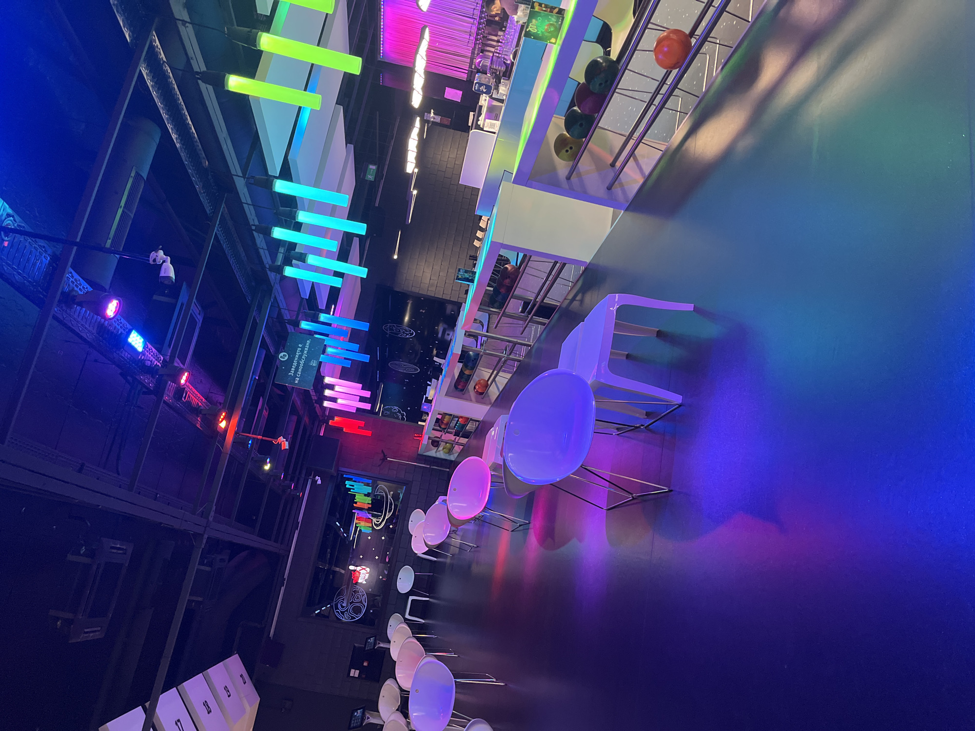 The image depicts the interior of a modern bowling alley or entertainment center, specifically Happy City at Funtopia, located within Bulgaria Mall, bul. "Bulgaria" 69, 1404 Manastirski Livadi, Sofia, Bulgaria. The scene is illuminated by dynamic, multi-colored LED lighting, creating an atmosphere dominated by neon blues, greens, pinks, and purples that reflect off the dark, polished floor and various surfaces. Rows of white, contemporary chairs with thin metal legs are arranged in the foreground and midground, facing away from the viewer, their surfaces absorbing the ambient colored light. Along the right side, multiple bowling lanes are visible, each equipped with white, multi-tiered counters that hold racks of bowling balls in colors such as green, yellow, red, and purple. The ceiling features exposed industrial elements including dark pipes, ventilation ducts, and a grid of metal framework, from which numerous hanging linear and tube lights emit vibrant hues. Multiple security cameras (CCTV) are mounted on the ceiling structure. The background includes dark, brick-textured walls and a large reflective surface displaying stylized graphics of planets and a bowling pin with a cupcake. A green sign with white text reads "Заведението е на самообслужване." (The establishment is self-service.), and an "EXIT" sign with "ИЗХОД" (Bulgarian for exit) is also visible. One individual, partially obscured, is visible behind a counter towards the far right of the image, wearing a dark shirt. The overall scene is clean and orderly, with no active bowling or significant human interaction visible, presenting a static view of the facility's setup.