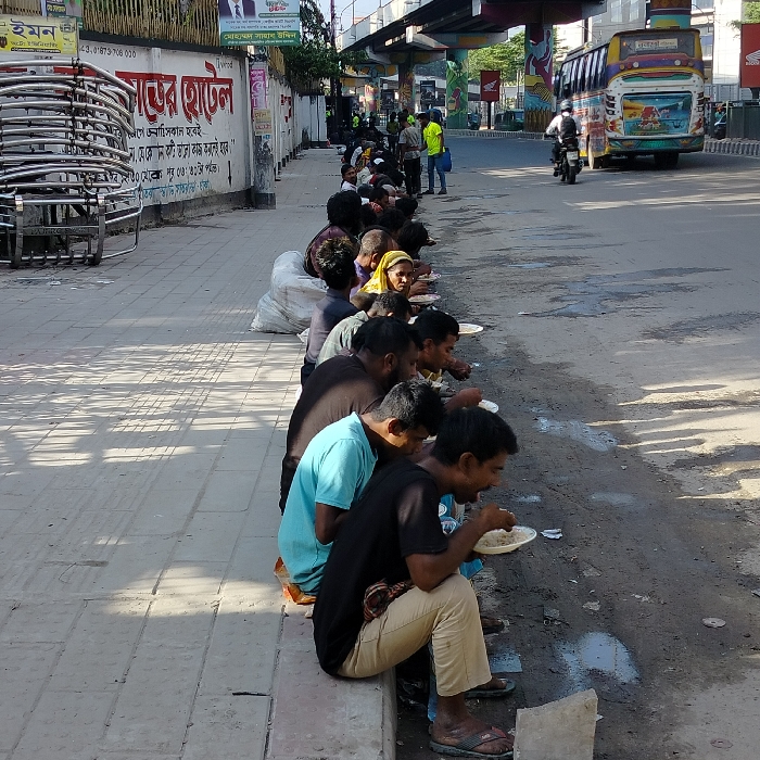 The image depicts an outdoor urban scene in Dhaka, Bangladesh, specifically alongside a public road featuring an elevated concrete overpass structure