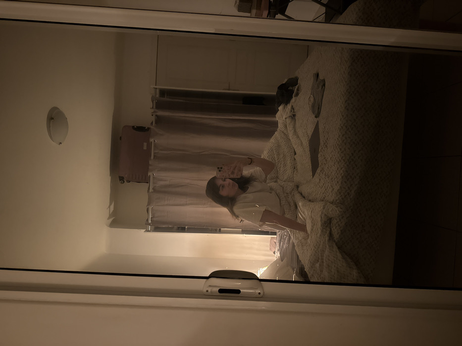 A person takes a selfie in a mirror, situated horizontally. The reflection shows a bedroom scene: a bed with a white patterned duvet, a laptop, and clothing items atop the bed. Curtains hang behind the bed and a pink suitcase stands against the wall. An overhead light is visible on the ceiling. The mirror frame is white with a handle in the foreground.