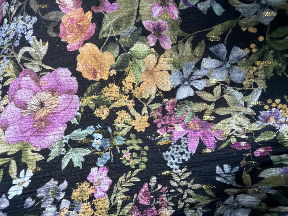 A textured black fabric is adorned with a vibrant floral pattern. Large pink and purple blossoms dominate, accompanied by smaller blooms in shades of orange, blue, and yellow. Green leaves and foliage fill the spaces between the flowers, creating a dense and lush effect. Fine gold threads accent the design, adding a subtle shimmer to the fabric. The overall impression is one of rich, colorful, and slightly vintage-inspired elegance.