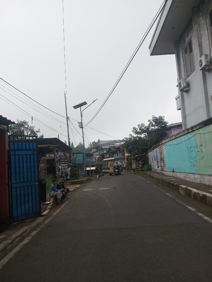 A quiet street scene unfolds under an overcast sky. A yellow motorized tricycle travels down the center of the paved road. A blue gate stands to the left, where a woman and children sit along the curb. A weathered building with air conditioning units attached is on the right, next to a turquoise wall with graffiti. Utility poles with wires stretch across the sky. The street leads into a neighborhood with buildings and greenery in the distance.