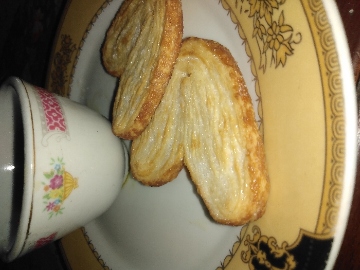 An overhead close-up view depicts a light-colored ceramic plate holding a decorated teacup and three pastries. The cup, positioned at the top-center, is white with a gold rim, featuring a colorful floral basket design on one side and a repeating pink geometric pattern on another section. It contains a dark liquid, consistent with coffee or tea. The round plate is predominantly cream-colored, bordered by an intricate black and gold/yellow decorative pattern incorporating scrollwork and repeating designs. In front of the cup, three golden-brown palmier pastries are arranged. These pastries exhibit a layered, flaky texture and are visibly coated with sugar crystals. The scene is illuminated by an artificial light source, suggesting an indoor setting within the city of Phouviang-Gnai, Laos.
