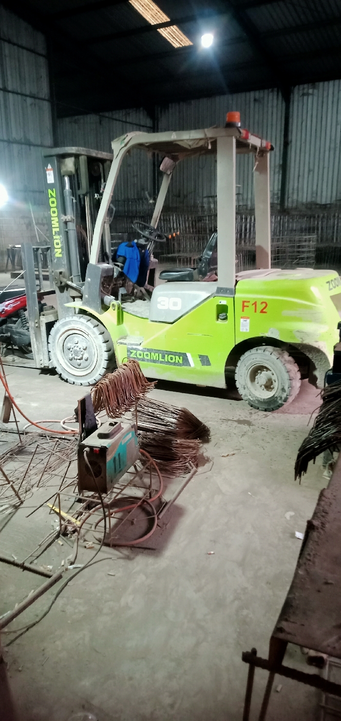 A green Zoomlion forklift with the number 30 and F12 on it sits in a dimly lit warehouse with metal walls and a corrugated metal roof. Near the forklift are bundles of metal rods and a welding machine on a wheeled cart. Rebar structures and metal wire are also visible. Overhead lighting illuminates the scene.