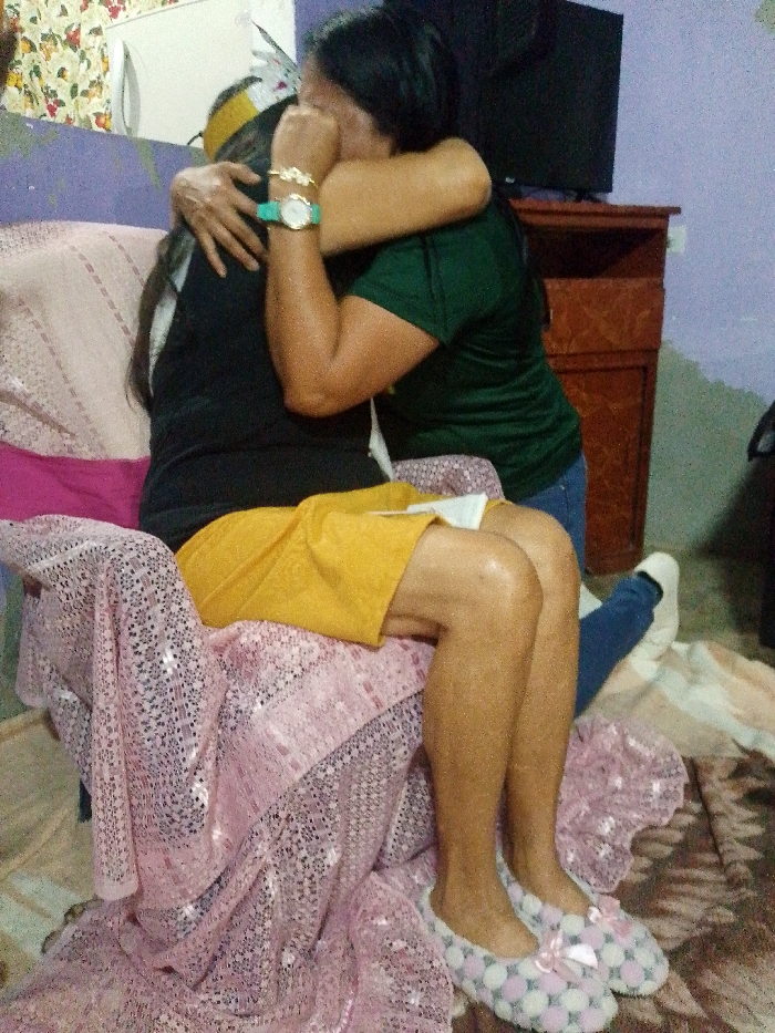 Two women embrace in a room. One sits in a chair draped with a pink and white lacey cloth, wearing a black top, yellow skirt, and polka-dot slippers. The other woman, standing, wears a green shirt and blue jeans. Her face is obscured in the hug. A television and wooden cabinet are visible in the background, along with light purple walls. A pink blanket and patterned rug are also present in the scene.