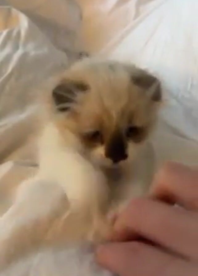A short, medium shot captures a small, fuzzy kitten on a white sheet, likely a bed