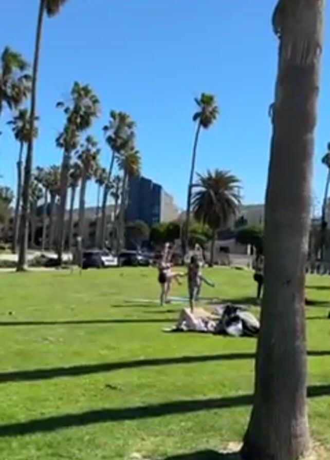 The scene is a sunny day at a park with palm trees lining the background. Several people are doing yoga on the grass. In the background, on the road next to the park, there are multiple cars, including a police car.