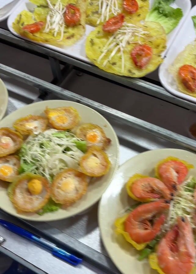 The video presents a selection of Vietnamese street food laid out on metal trays, likely in a food stall or market setting. The camera pans across several dishes. There are yellow savory pancakes topped with shrimp, shredded vegetables, and in some cases, small fried quail eggs. Other dishes include spring rolls, grilled meat skewers, and a plate of fried rice garnished with chopped scallions and peppers. The dishes are ready to be served.