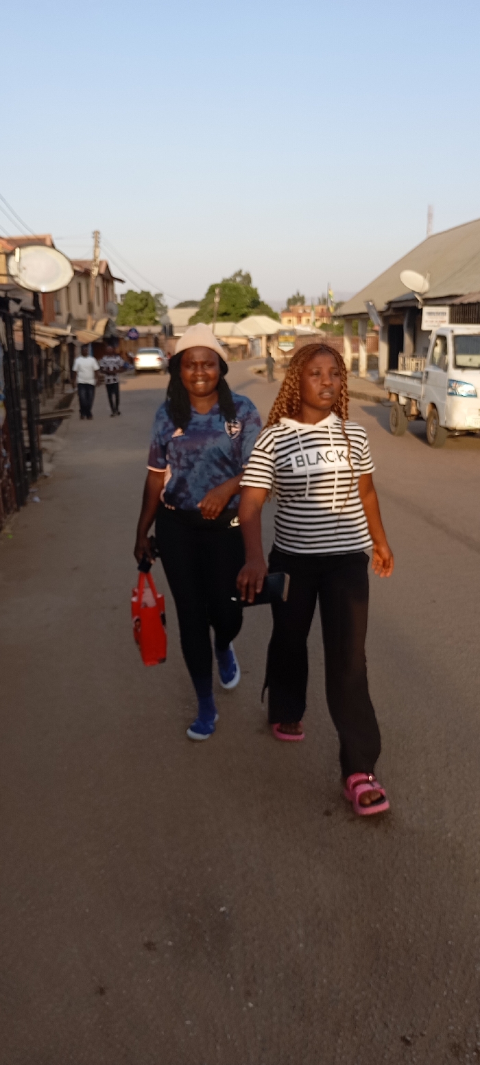 two adult females walking side-by-side on a paved road in a city street, identified as Jos, Nigeria