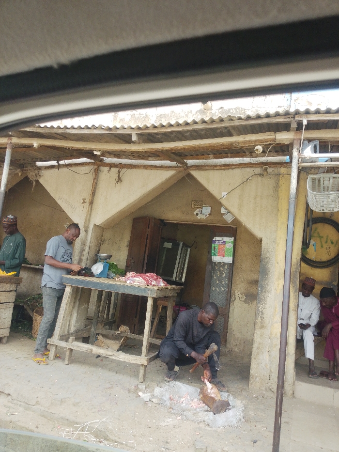 - "The image depicts an outdoor meat processing and retail scene in Hotoro North, Nigeria, under a makeshift corrugated metal roof supported by wooden beams" by FM-AtgEX2, licensed under CC BY 4.0
