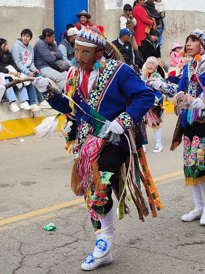 A person in a vibrant, traditional Peruvian costume is captured mid-dance in the street. The ensemble includes a blue jacket with intricate embroidery, a patterned headpiece, a striking mask with a mustache, and elaborately decorated pants with flowers. Colorful tassels and fringes adorn the outfit. He holds a rope with a white tassel. Spectators sit on a ledge in the background, observing the performance. Other dancers can be seen in the frame.