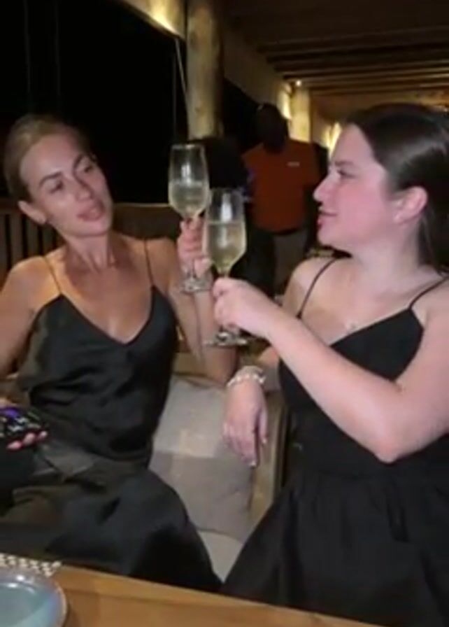 Two women are seated at a table outdoors at night. They are dressed in black spaghetti-strap dresses and holding champagne flutes filled with a light-colored liquid. They clink their glasses together and take sips. The woman on the left holds a cell phone in her left hand. In the background, a Black man in an orange shirt walks behind them. The area appears to be a restaurant or bar with a wooden structure and decorative lighting.
