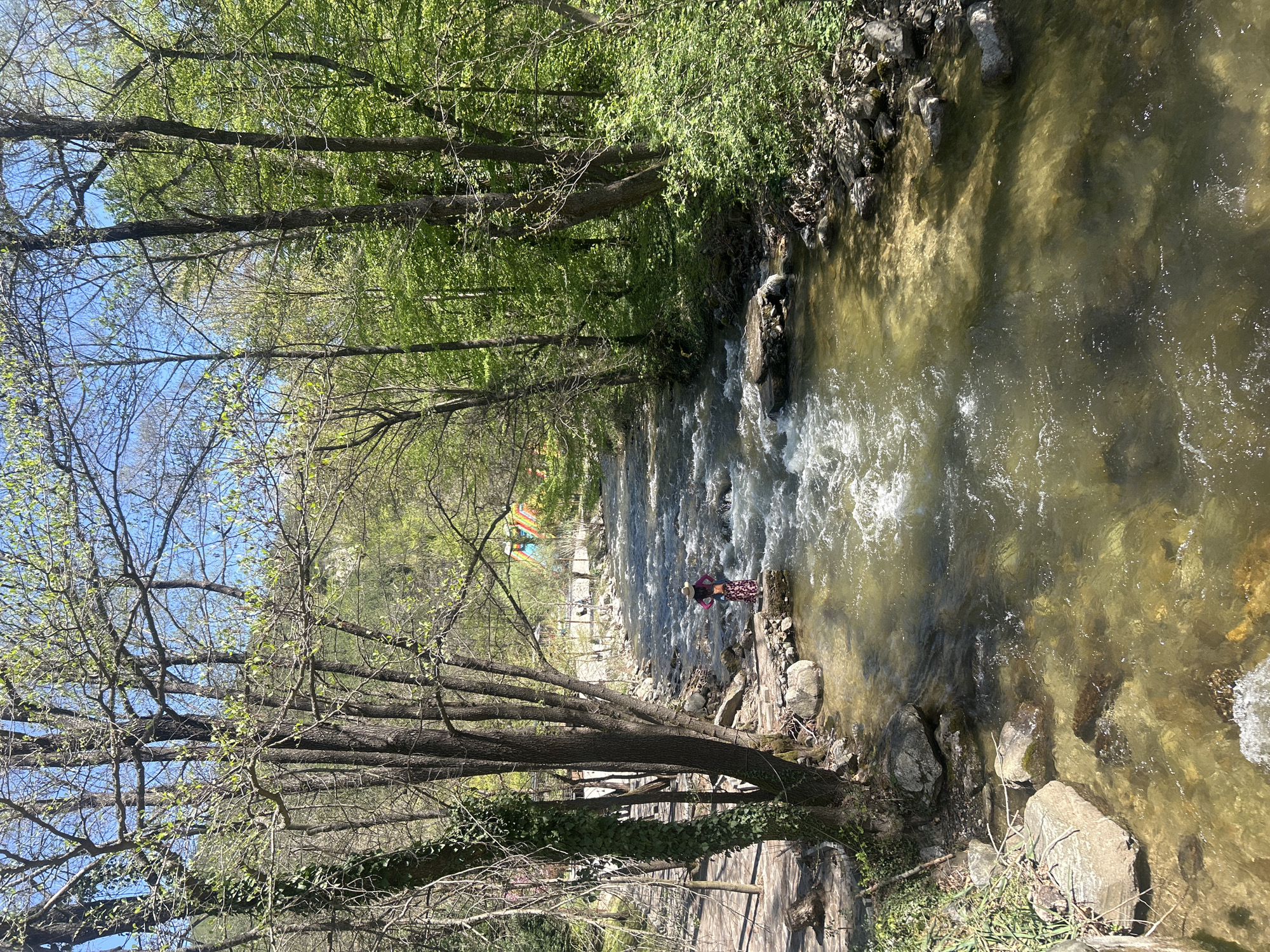 river flowing through a wooded area. A person is standing on the bank of the river, wearing a hat and a dress. The water is clear and flowing rapidly. The trees are tall and green, and there is a blue sky overhead. The image was taken in the city of Blagoevgrad, Bulgaria.