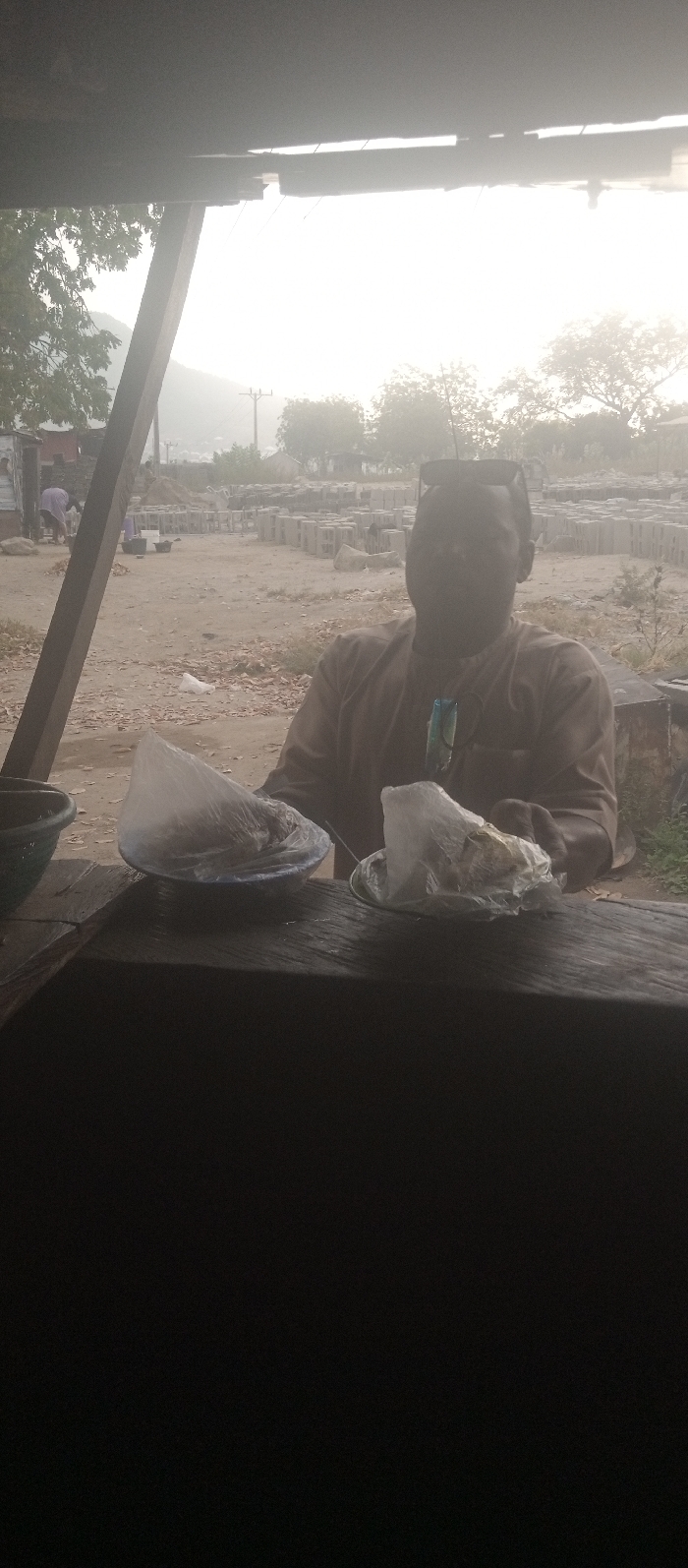 The scene is located in Adankolo, Nigeria, depicting a semi-sheltered outdoor area. A male individual is seated behind a dark wooden counter, facing forward. He wears a light brown, long-sleeved garment, and dark sunglasses are perched on his head. A lanyard with an attached item hangs around his neck. On the counter in front of him are two plates, each containing food wrapped in clear plastic bags; the plate on the left is blue, and the one on the right is white/silver. A dark green bowl is visible to the far left on the counter. The background reveals a dusty, unpaved ground. Numerous gray concrete blocks are stacked in rows across the mid-ground, indicating a construction material depot or manufacturing site. In the distance, another person is seen bending over near a structure. Trees, a utility pole, and distant hills or mountains are visible against a bright, hazy sky. A prominent wooden support beam is positioned diagonally on the left, partially framing the view.