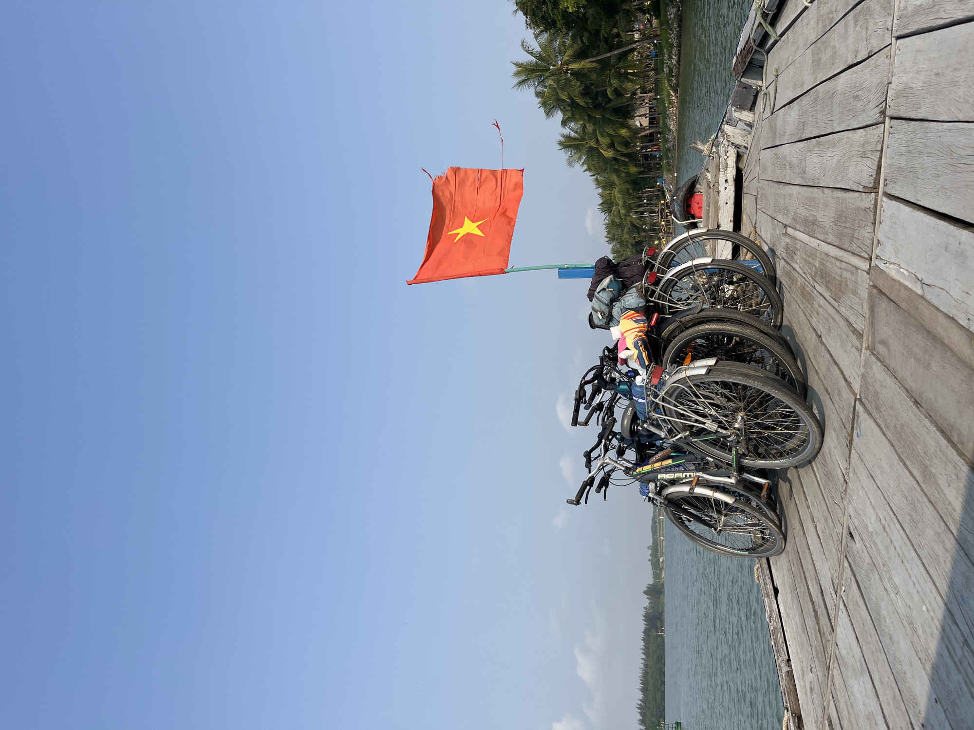 The image depicts a daytime scene from the deck of a wooden boat or ferry on a river in Hội An Ward, Vietnam. At least five bicycles are positioned upright on the boat's weathered wooden deck, with some displaying rear racks holding backpacks and other luggage. A red Vietnamese flag, featuring a yellow five-pointed star and showing signs of fraying, is affixed to a pole on the right side of the vessel, flying in the wind. The river's surface exhibits slight ripples. The right bank of the river is densely lined with tall palm trees, with faint structures visible behind them in the distance. The left bank is characterized by a strip of dark green vegetation, and a bridge is discernible in the far background. The sky above is clear and blue with minimal cloud cover. No individuals are visible in the scene.