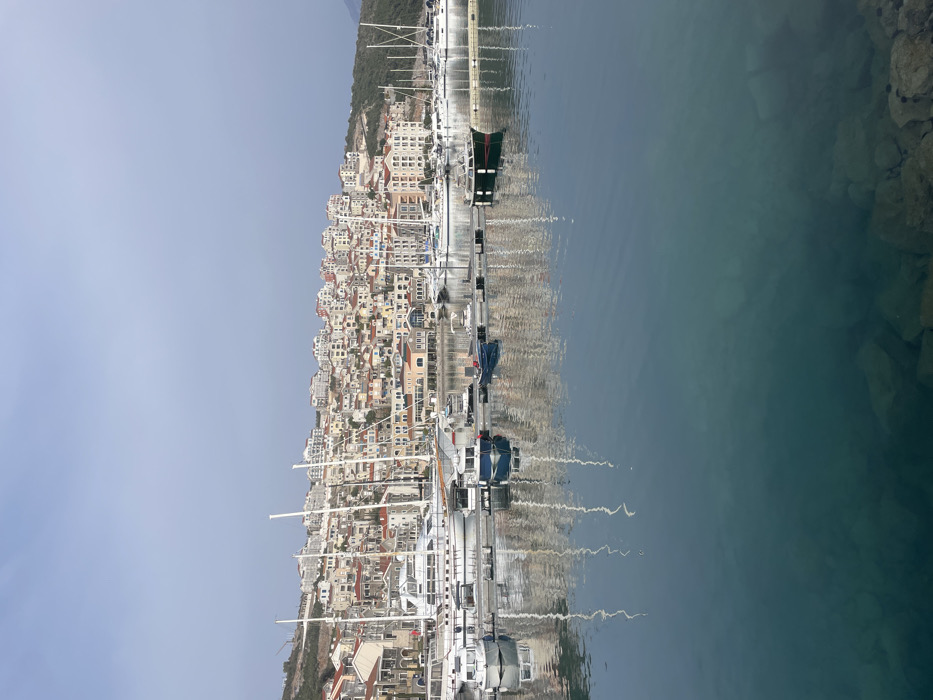 The image presents a panoramic view of a marina and a hillside town, identified as Lustica Bay, situated in the Radovići municipality, Montenegro. The lower two-thirds of the frame are occupied by calm, clear, blue-green water, which distinctly reflects the moored vessels and the architectural structures on the distant hillside. Submerged rocks are visible in the shallow water along the bottom edge, particularly in the lower right quadrant. Extending from the left and center-right are grey floating docks, forming walkways and mooring points. Numerous boats are docked, including multiple large white sailing yachts with prominent white masts positioned towards the left and center-left. Smaller motorboats are also present, including a blue-hulled vessel and a dark green-hulled vessel moored mid-frame. The background features a steep hillside densely covered with multi-story residential and commercial buildings. These structures display light-colored facades, often with balconies, and terracotta or red-tiled roofs, creating a tiered architectural landscape ascending the slope. Sparse green vegetation is visible on the upper parts of the hill. The sky, occupying the top third of the image, is a pale blue, appearing hazy or lightly overcast. No individuals are discernible within the scene.