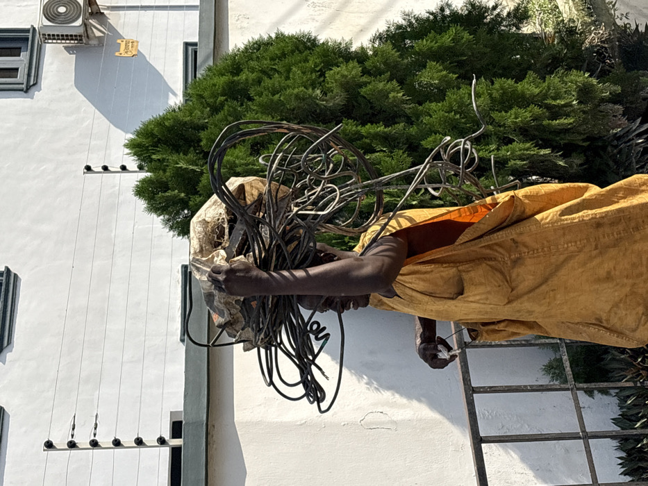 In Igboefon, Nigeria, a dark-skinned male is depicted from the upper torso, facing left and slightly angled towards the viewer. He wears a loose, mustard-yellow tunic with visible pockets. On his head, he balances a substantial, irregularly bundled mass of dark, intertwined electrical wires or cables, resting atop a crumpled, light-colored fibrous material. His left arm is raised, with the hand assisting in stabilizing the headload. His right hand grasps a small, crumpled white object, possibly paper or cloth, along with a thin wire. The subject displays a subtle smile or grimace. The background consists of a two-story white building featuring dark-framed windows and an external air conditioning unit mounted on the upper right facade. Along the top of a lower wall or parapet, an electric fence system is visible, comprising multiple horizontal wires supported by silver-colored vertical posts. A dense, dark green conifer-type tree stands prominently behind the subject, to the right. Bright sunlight illuminates the scene, casting crisp shadows. A dark metal railing or fence is partially visible in the lower left foreground.