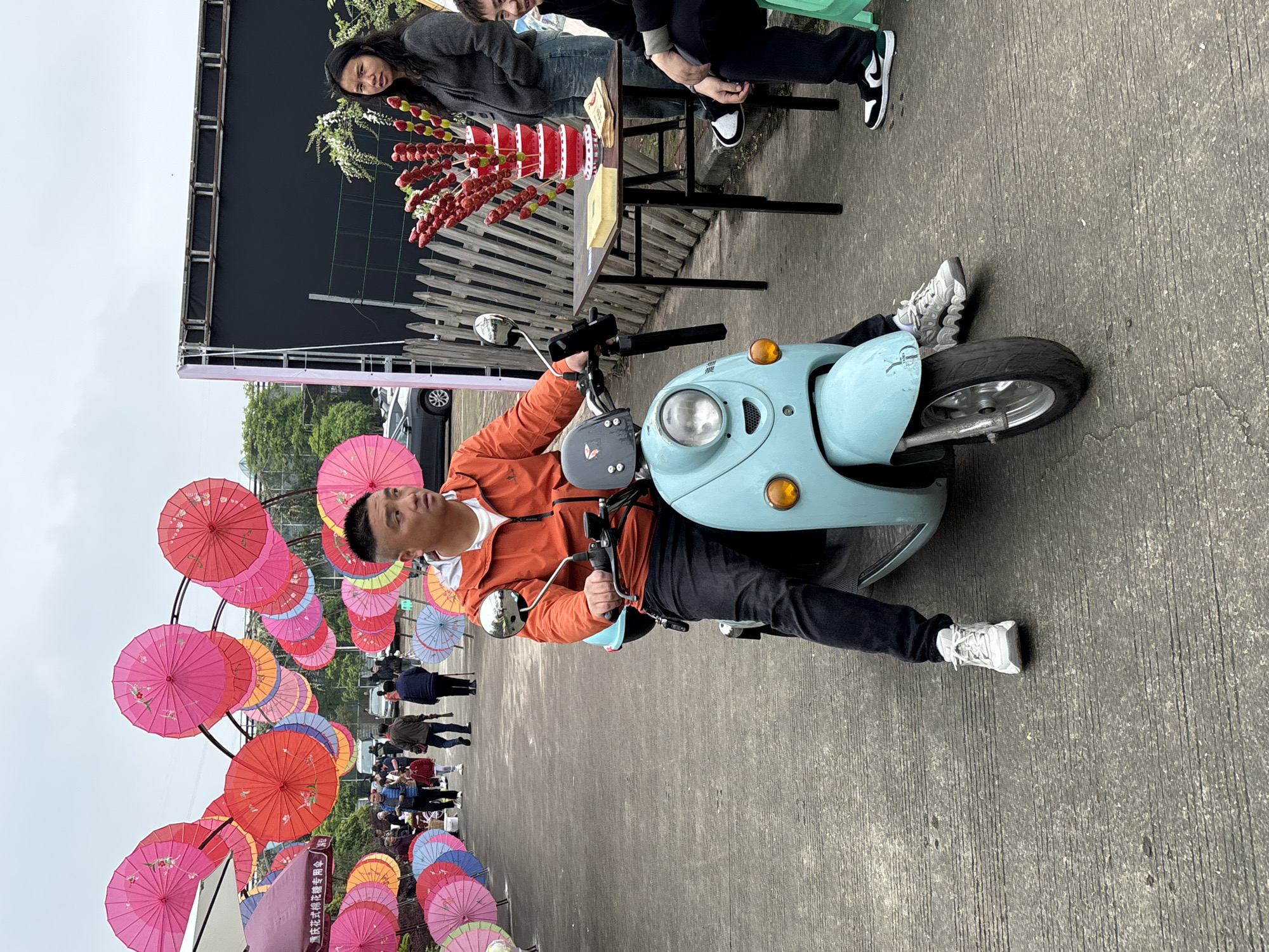 A full-length medium shot depicts a man sitting on a light blue scooter on a gray, textured concrete surface. The man is wearing an orange jacket, black pants, and white sneakers. The scooter is parked near a display of colorful umbrellas arranged in a semi-circular arch. Behind the man, a group of people can be seen walking along the paved surface. In the background, a black structure with a wooden fence is present, with two individuals standing nearby. One person is seated at a table displaying what appear to be candied fruit skewers. The scene is located in Xianfeng, China.