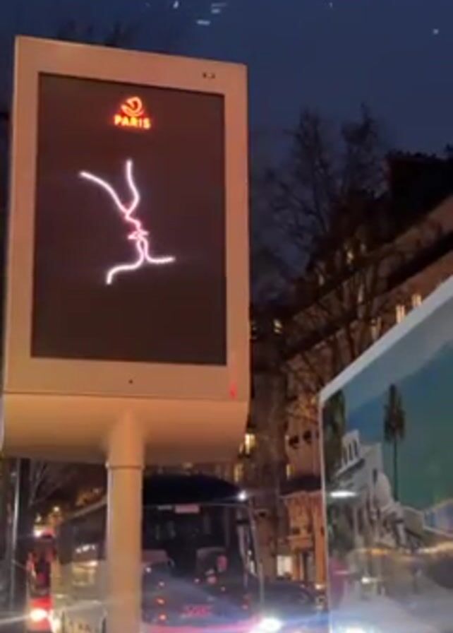 digital advertising display in Paris, France, at dusk. The display initially features the word "Paris" with a logo above it, followed by a line drawing of a couple kissing. The street scene includes buses and cars moving past in the background, with buildings on either side.