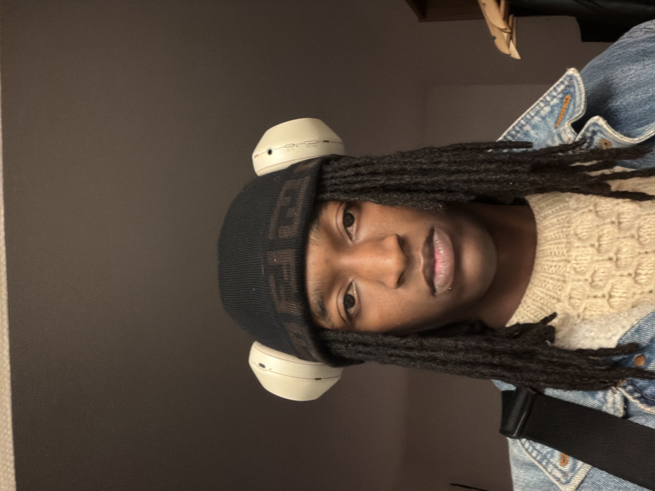 A person wearing a black beanie with a Fendi logo print is shown facing forward. Two white, cylindrical objects are perched on top of the beanie, resembling bear ears. The person has dark skin and dreadlocks that frame their face. They are wearing a cream-colored sweater and a blue denim jacket. A black strap is visible across their chest. The background is a muted gray tone.