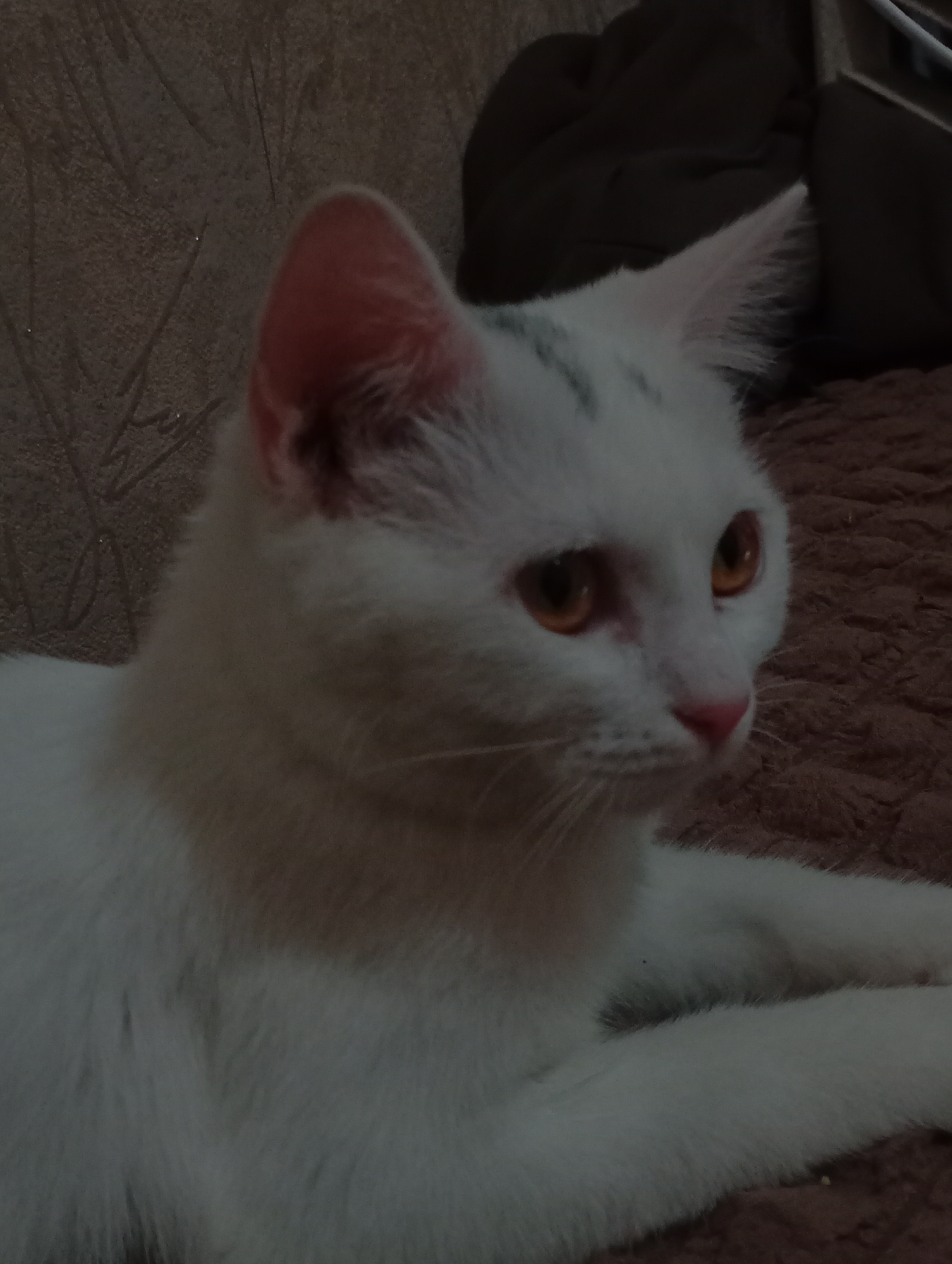 A white domestic feline is depicted resting indoors in Kurganinsk, Russia. The cat exhibits predominantly white fur, distinct amber-orange eyes, a pink nose, and light pink inner ears. Subtle grey tabby markings are visible on its forehead. The animal is positioned with its head turned slightly to the right, facing away from the direct line of sight, with its front paws extended forward. It rests on a textured, reddish-brown fabric surface. The immediate background to the left features a light brown, subtly patterned surface, possibly upholstery or a wall, while a dark, indistinct object, likely a cushion or draped fabric, is present in the upper right corner. The scene is under low, ambient illumination.