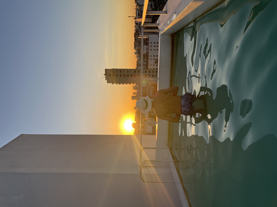 A man wearing a hat and swim trunks stands in a rooftop swimming pool, facing a cityscape. The sun is setting, casting a warm glow over the buildings and reflecting in the water. The sky is a gradient of blue and orange. A white structure is visible on the left, while the pool's edge is on the right, creating a serene and elevated scene.