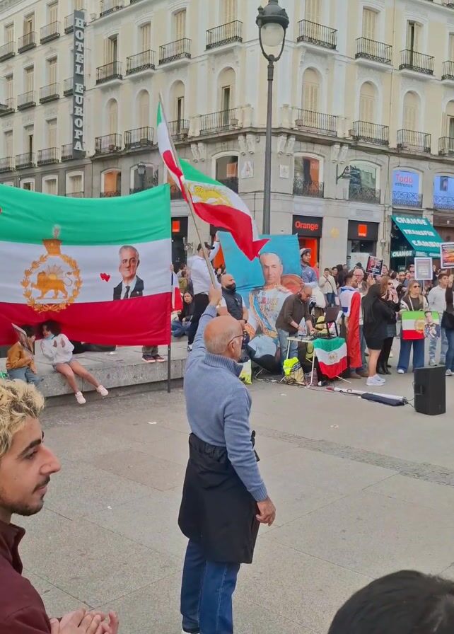 group of people gathered in a plaza, likely a political protest or rally. They are holding up Iranian flags, some of which feature portraits of figures, possibly former leaders. There's a banner with the text "King Reza Pahlavi El heredero legal del trono," which translates to "King Reza Pahlavi, the legal heir to the throne." The crowd is diverse in age and appearance, and some individuals are clapping. The setting appears to be an urban environment with tall buildings in the background. The weather looks overcast.