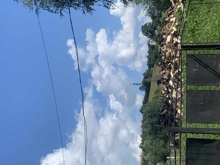 The image captures an outdoor scene in Yasinia, Ukraine, on a bright day with a clear blue sky and numerous white cumulus clouds. In the foreground, a black, ornate wrought iron gate, partially obscured by green vegetation on the right, spans the lower portion of the frame. Above the gate, a substantial mound of split, light-colored firewood occupies the midground. A single individual, dressed in dark clothing (possibly a dark blue shirt), is observed from behind on the left side of the firewood pile, appearing to interact with or move the logs. Behind the firewood, rolling green hills covered with dense trees and patches of grassland extend into the background. A tall, black metal lattice tower, likely for power transmission or communication, stands prominently on a distant hillside to the left of center. To the right, on another distant hill, a multi-story house with a light-colored facade and a dark roof is visible nestled among trees, with a smaller ancillary structure partially visible further to its right. Two dark, horizontal overhead power lines traverse the upper sky, with one appearing straighter and higher than the other, which sags slightly. Sparse tree foliage is visible along the far right edge of the image.