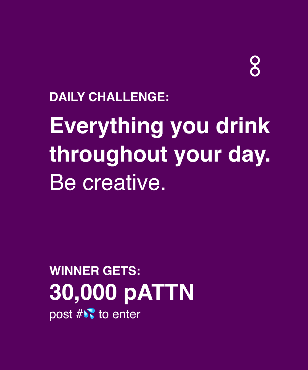 A graphic in purple presents a "Daily Challenge" to creatively document everything one drinks throughout the day. The winner receives 30,000 pATTN. Participants must post using the hashtag featuring a droplet emoji to enter. The number eight is prominently displayed in the upper right corner.